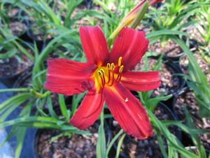 - 3" flowers are bright red with a yellow - green throat. Stems are well branched and well budded. Repeat bloomer. Mature height 24" tall.